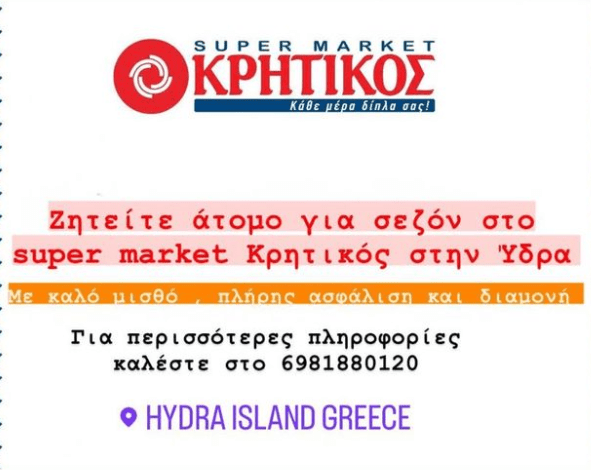 Το Super Market «ΚΡΗΤΙΚΟΣ» ζητά Προσωπικό για υποκατάστημα στην Υδρα.