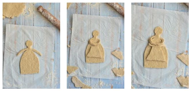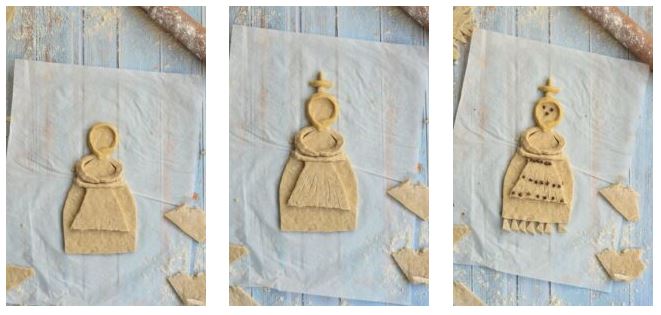 5.Με τα ζυμαράκια που έχουν μείνει δημιουργούμε πλάθοντας τα τη ποδιά, το σταυρό και το μαντήλι. Τα τοποθετούμε πάνω στο ‘’σώμα’’ της κ.Σαρακοστής.