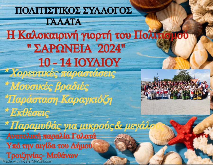 Ο Πολιτιστικός Σύλλογος Γαλατά «Οι Φίλοι της Παράδοσης» διοργανώνει και φέτος υπό την αιγίδα του Δήμου Τροιζηνίας – Μεθάνων μία απ’ τις ωραιότερες εκδηλώσεις του, την καλοκαιρινή γιορτή των «Σαρωνείων» για το 2024!