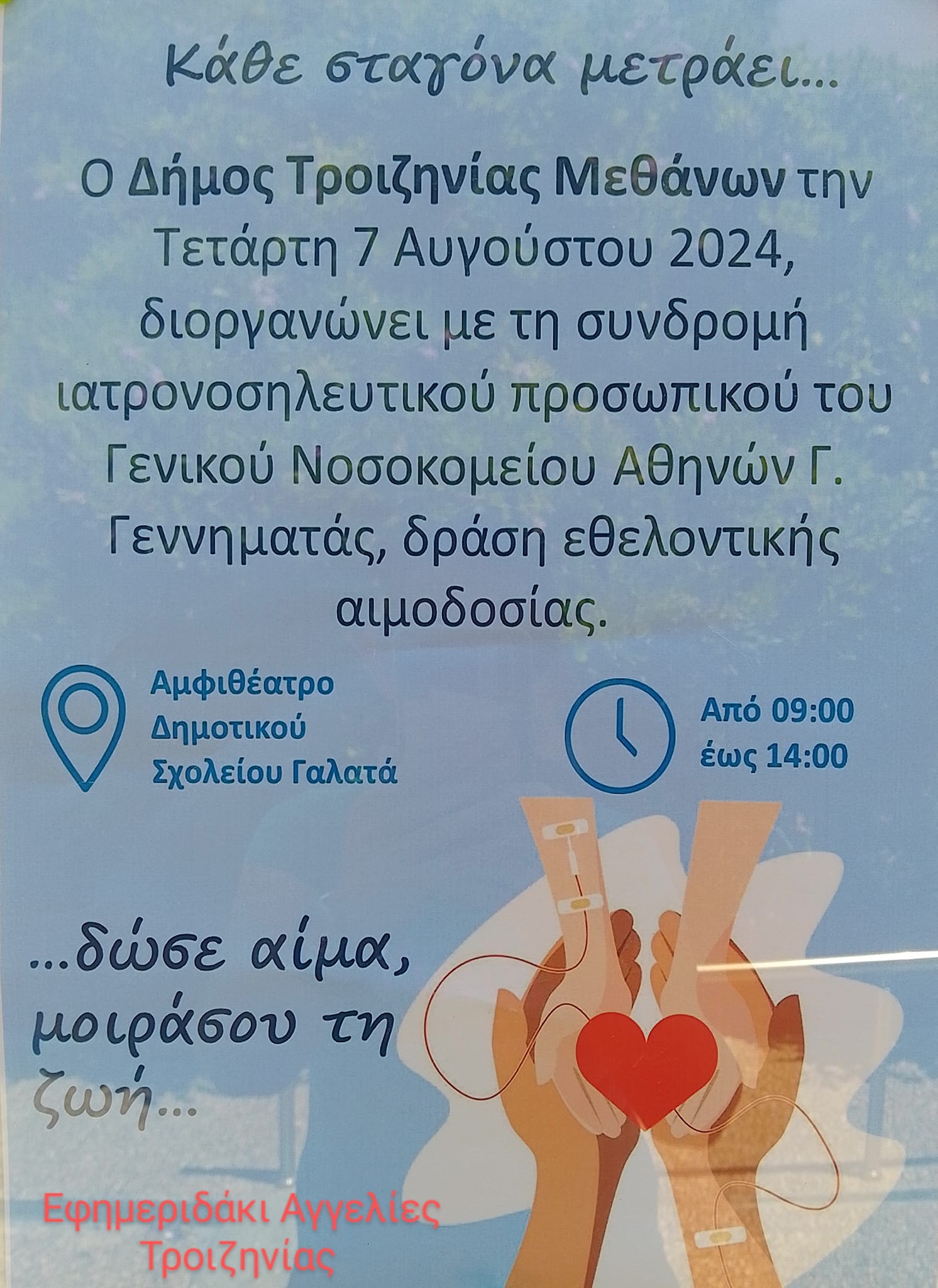 Ο Δήμος Τροιζηνίας – Μεθάνων διοργανώνει με τη συνδρομή ιατρονοσηλευτικού προσωπικού του Γεν. Νοσ. Αθηνών Γ. Γεννηματάς εθελοντική αιμοδοσία στις 7 / 8 / 24 στο Αμφιθέατρο του Δημοτικού Σχολείου Γαλατά από τις 9:00 π.μ. έως 2:00μ.μ.