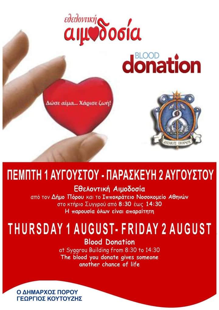 Ο Δήμος Πόρου & το Ιπποκράτειο Νοσ. Αθηνών διοργανώνει εθελοντική αιμοδοσία στο κτήριο Συγγρού από 1 / 8 / 24 έως 2 / 8 / 24 και ώρες 8:30 π.μ. – 2:30 μ.μ.