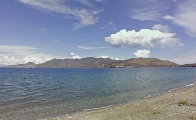 Μεγάλη παραλία, με βότσαλο και άμμο, που εκτείνεται μπροστά από τις εγκαταστάσεις του έρημου ξενοδοχειακού συγκροτήματος Stella Maris.
