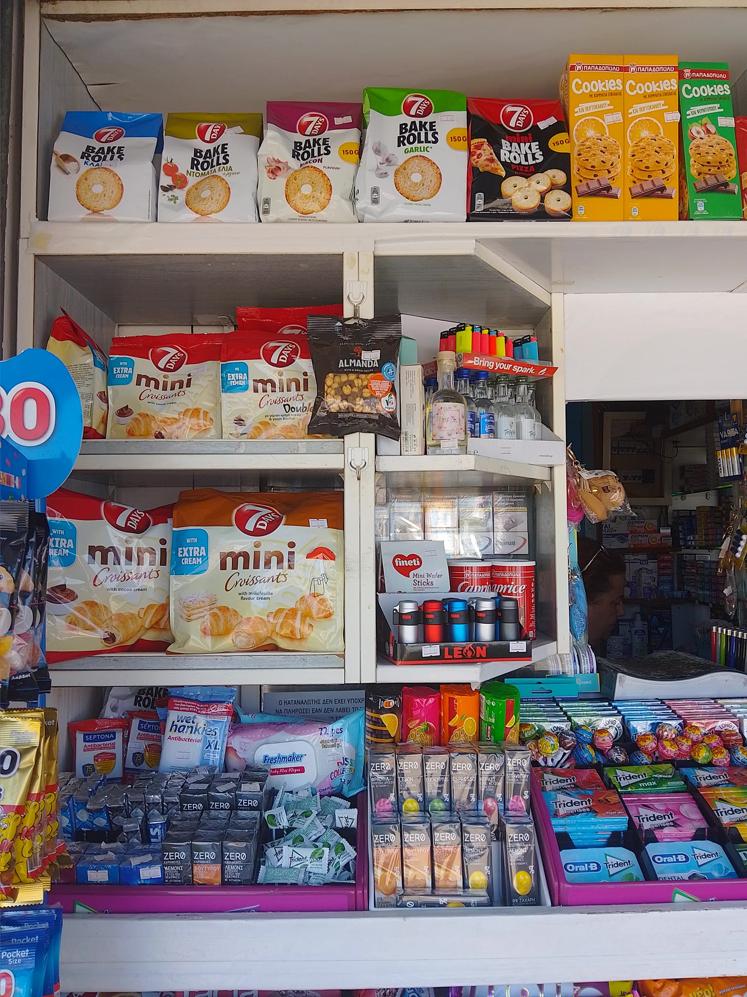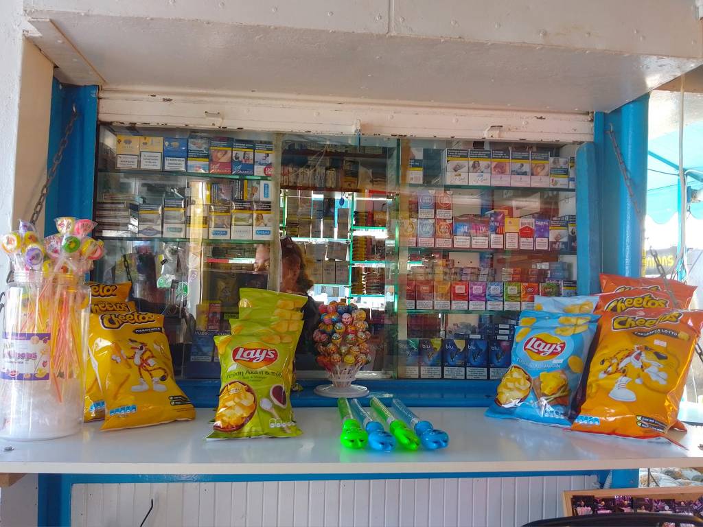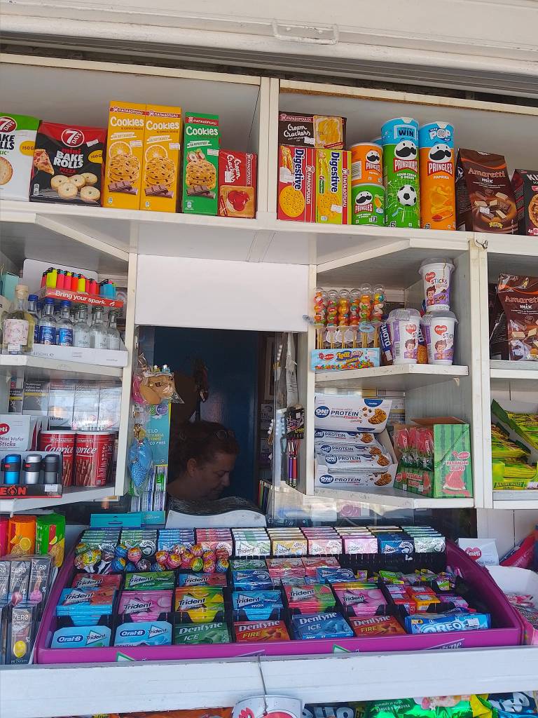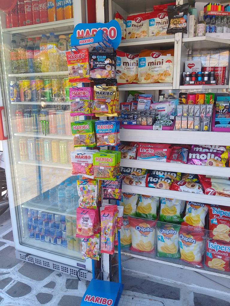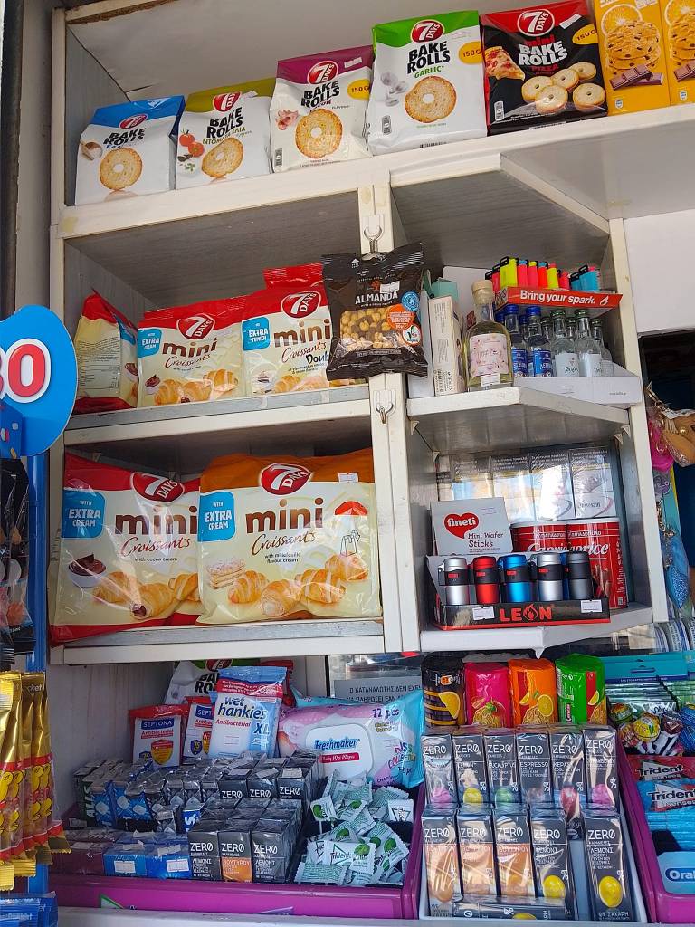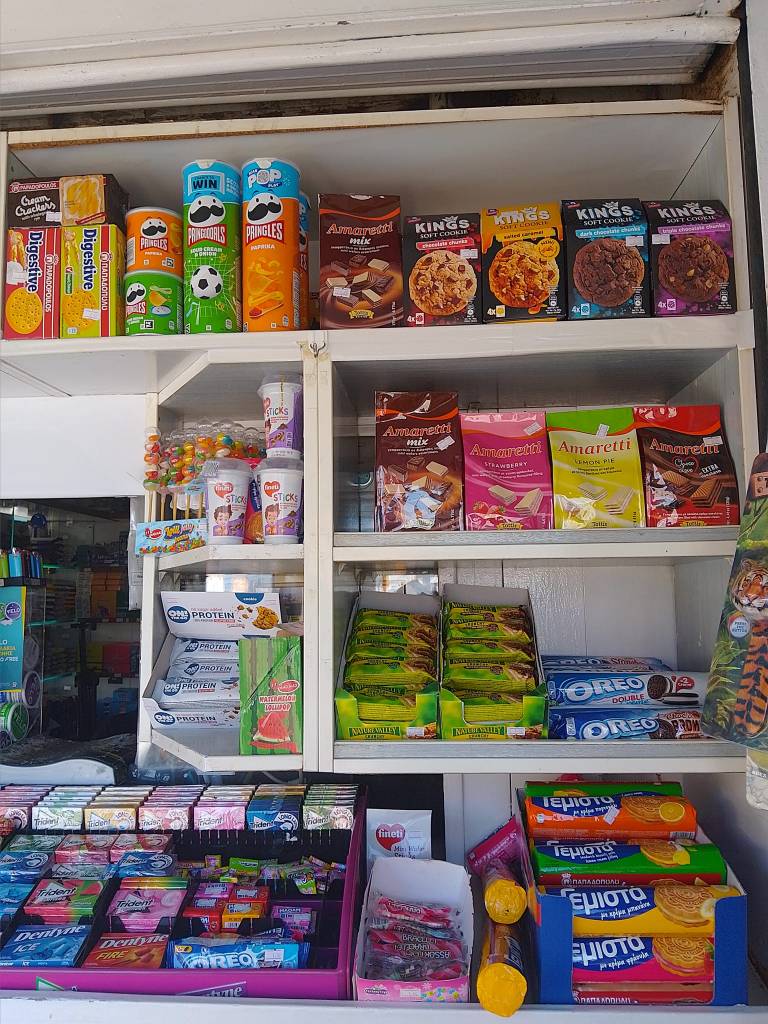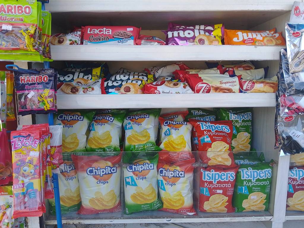 Μπισκότα, κρουασάν και σοκολάτες, τσίχλες, καραμέλες, ζελεδάκια, γαριδάκια, πατατάκια, εμφιαλωμένα νερά, αντισηπτικά μαντηλάκια!
