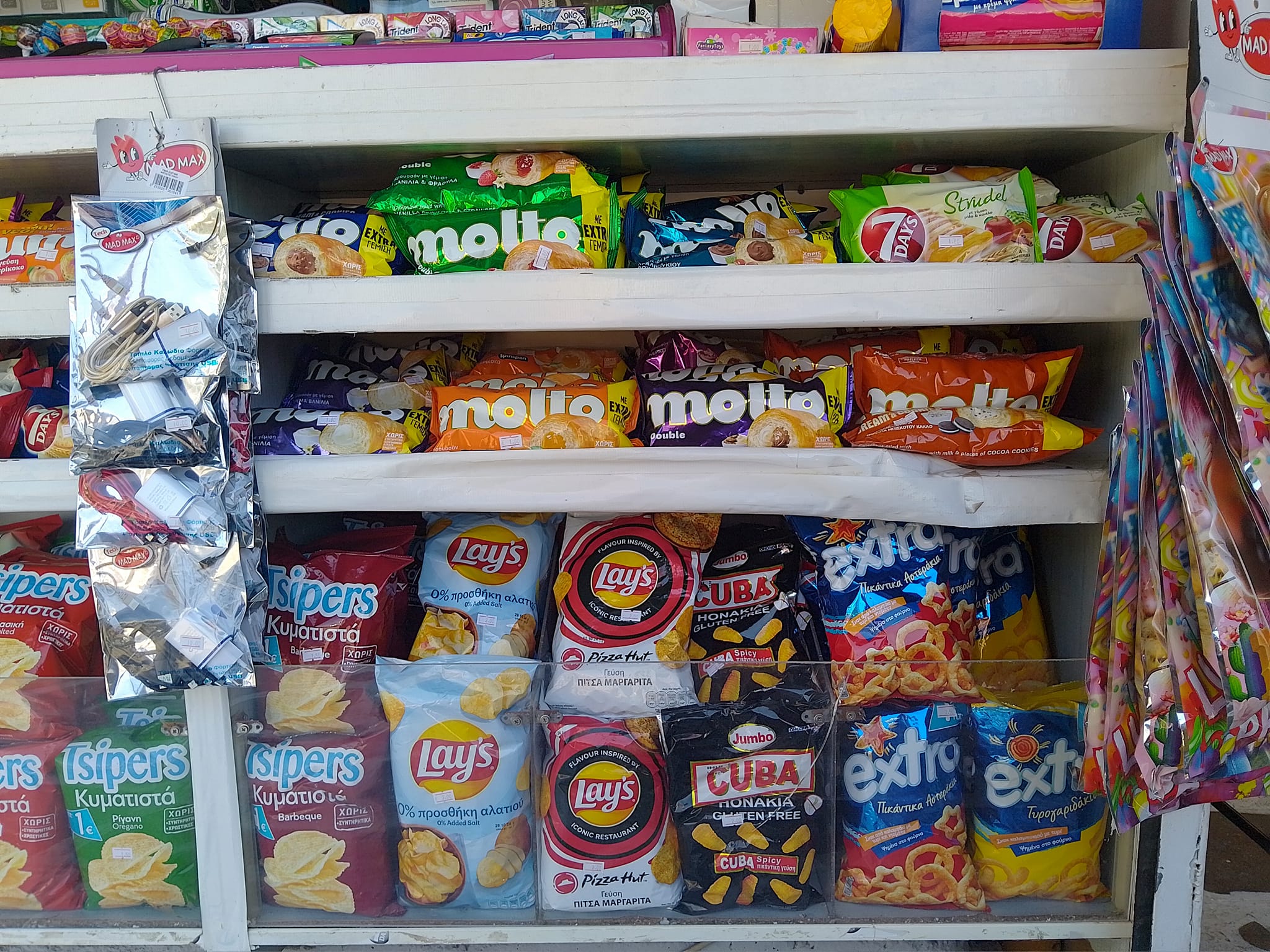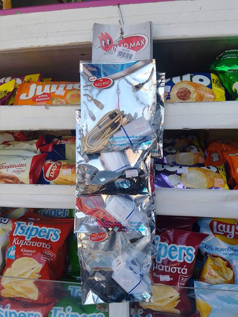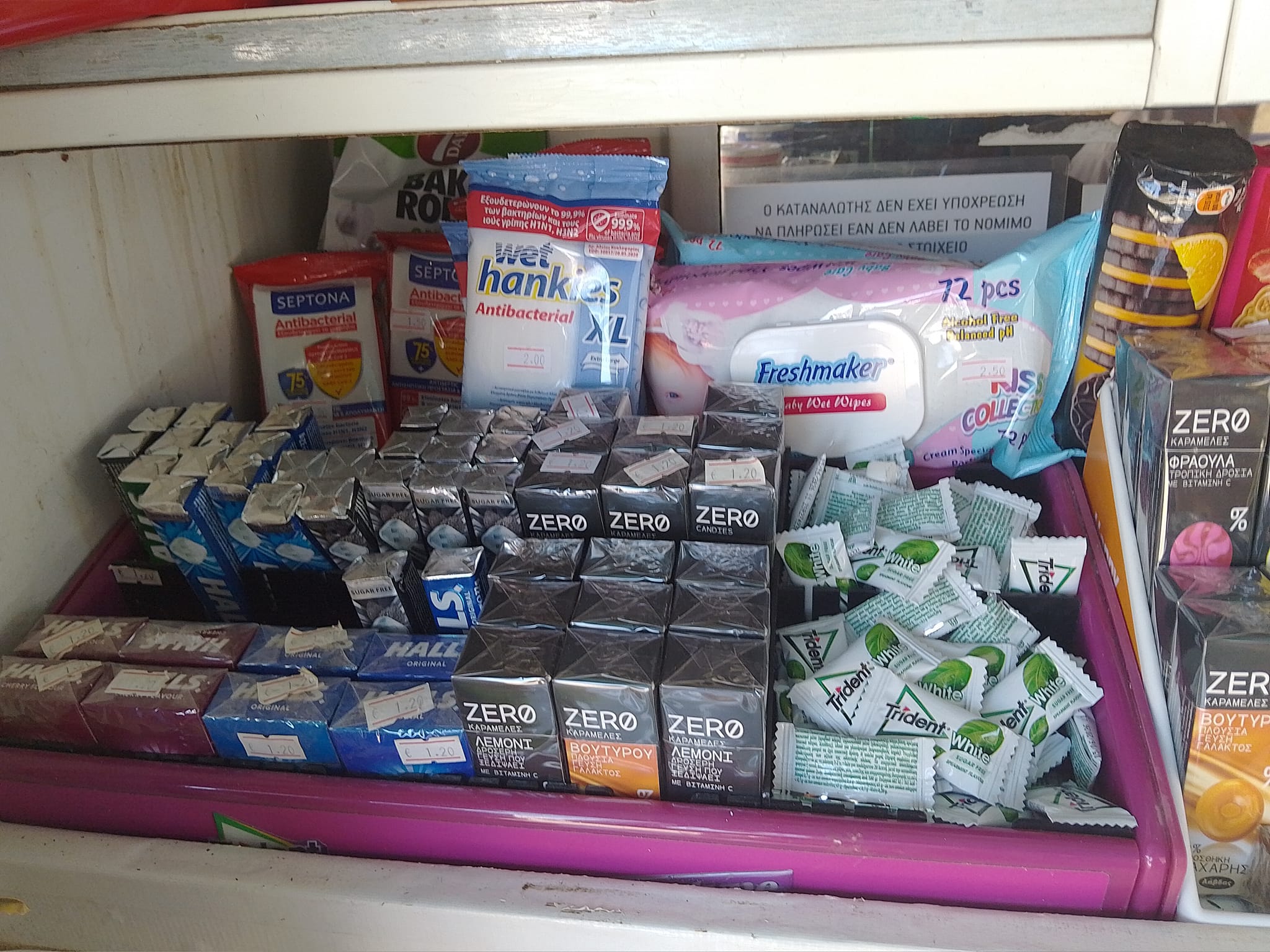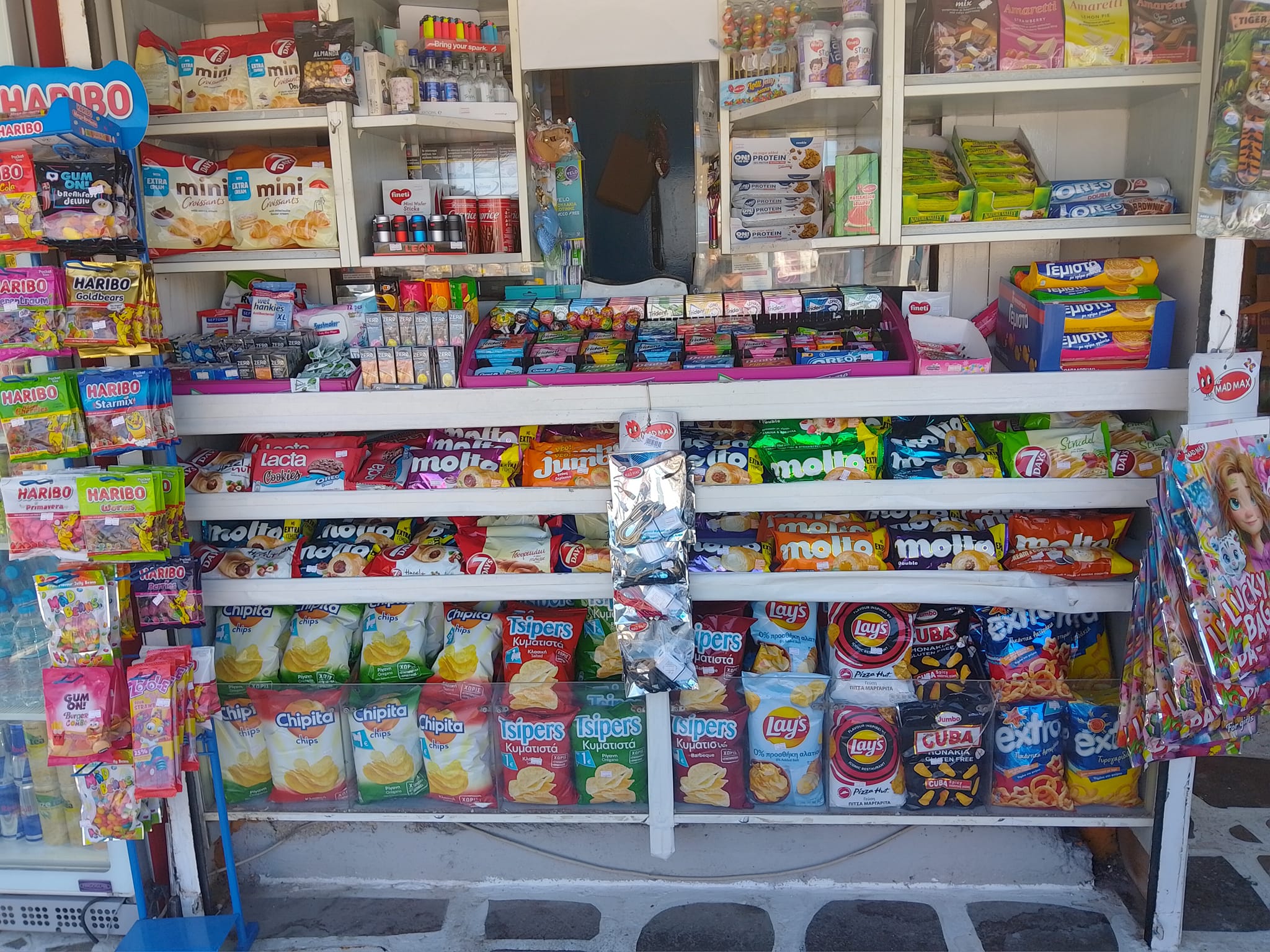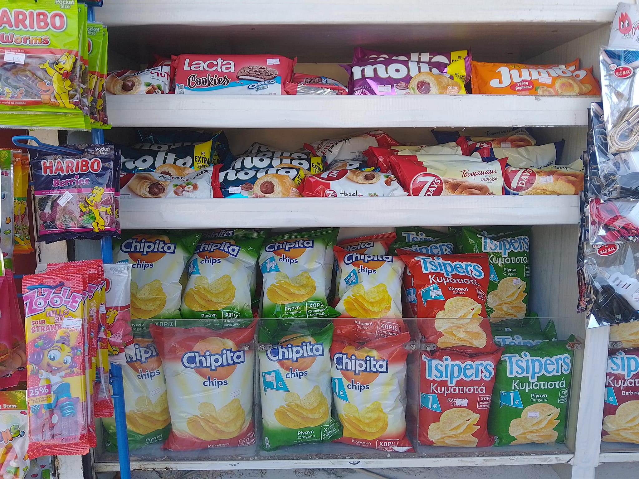 Μπισκότα, κρουασάν και σοκολάτες, τσίχλες, καραμέλες, ζελεδάκια, γαριδάκια, πατατάκια, εμφιαλωμένα νερά, αντισηπτικά μαντηλάκια!