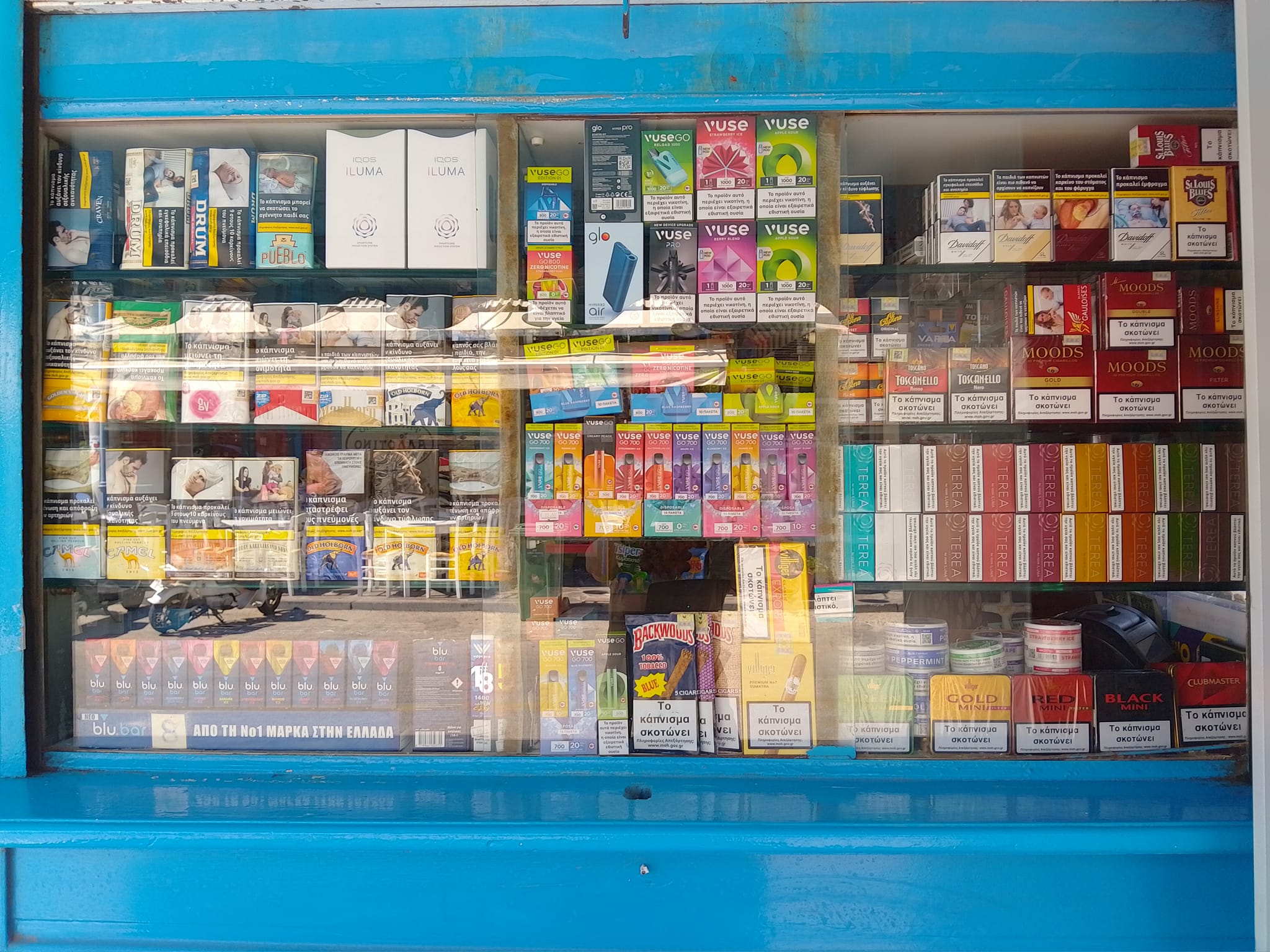 Μεγάλη ποικιλία τσιγάρων, είδη ηλεκτρονικών τσιγάρων, αναπτήρων, καπνού, πούρων.