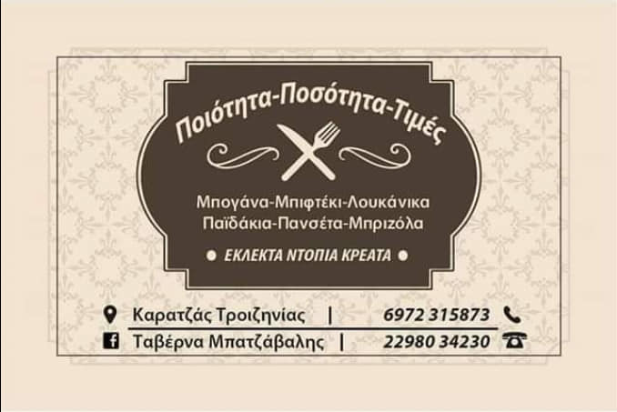 ΕΣΤΙΑΣΗ, ΚΑΡΑΤΖΑΣ Παραδοσιακή Χασαποταβέρνα Date: 19/08/2024Author: Wake up News 2 «Γ. Μπατζαβαλης» Στον Καρατζά Τροιζηνίας Τηλ: 6972315873 / 22980 – 34230 Ποιότητα – Ποσότητα – Τιμές! Με γνήσιες παραδοσιακές γεύσεις! Εξαιρετική και βραβευμένη! https://www.facebook.com/batzavali Κοινοποιήστε: Μοιραστείτε στο X(Ανοίγει σε νέο παράθυρο) Χ Mοιραστείτε στο Facebook(Ανοίγει σε νέο παράθυρο) Facebook Μου αρέσει! Φόρτωση... Σχετικά